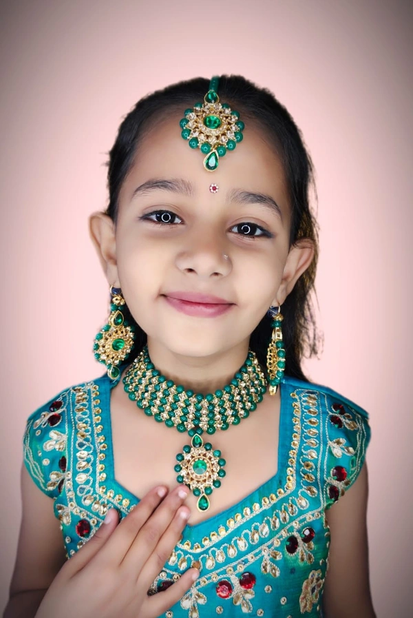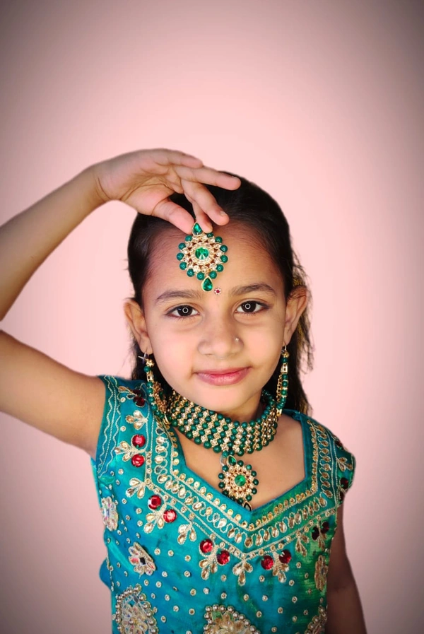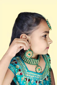 beautifully designed with artificial diamond, pearl and gold colour. ready to wear, easy to carry. pocket friendly. looks beutiful with all dress and saree. photo shared here is slightly different from orginal set due to photography.