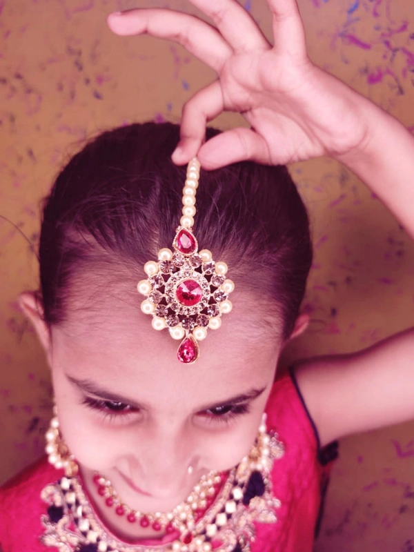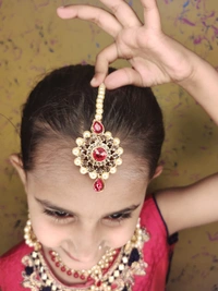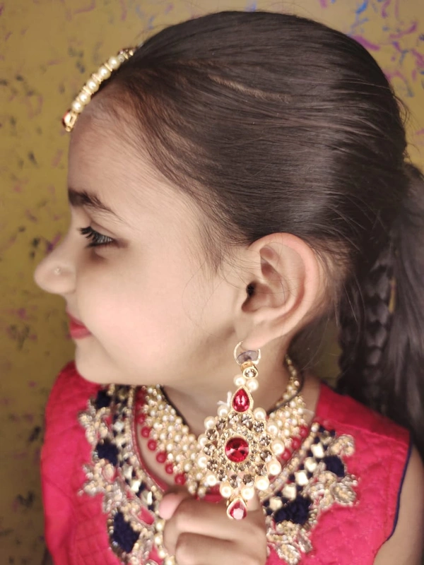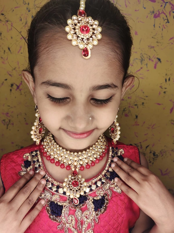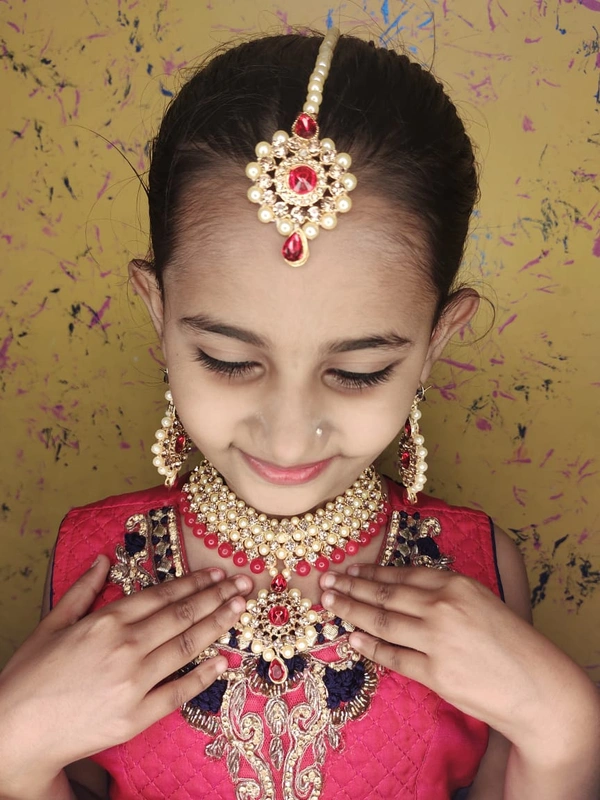 necklace set with red and gold pearls, suitable with all kind of dresses,saree and suit. easy to carry. beautifully designed.