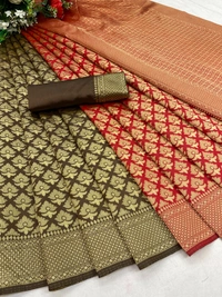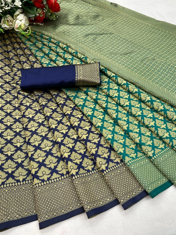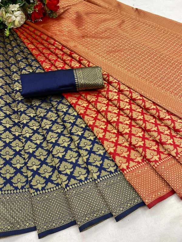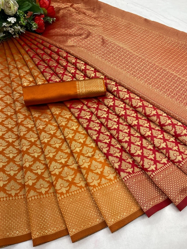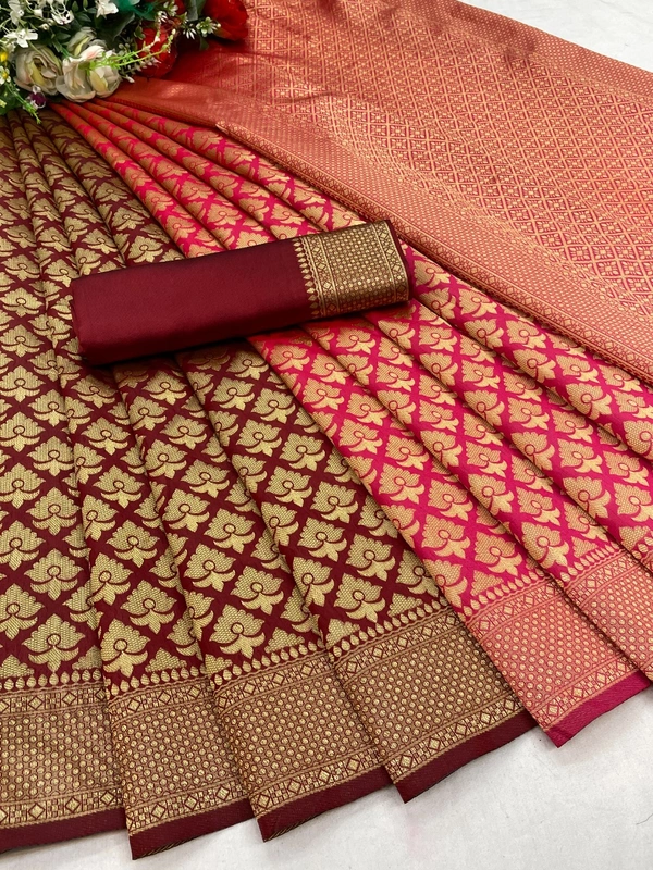 *Blouse:- Beautiful Heavy Weaving Work With Gold and Amazing With Contrast Colour Rich Pallu and Blouse*