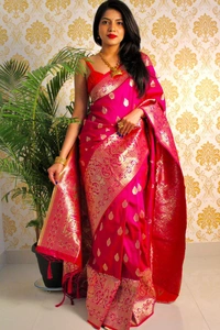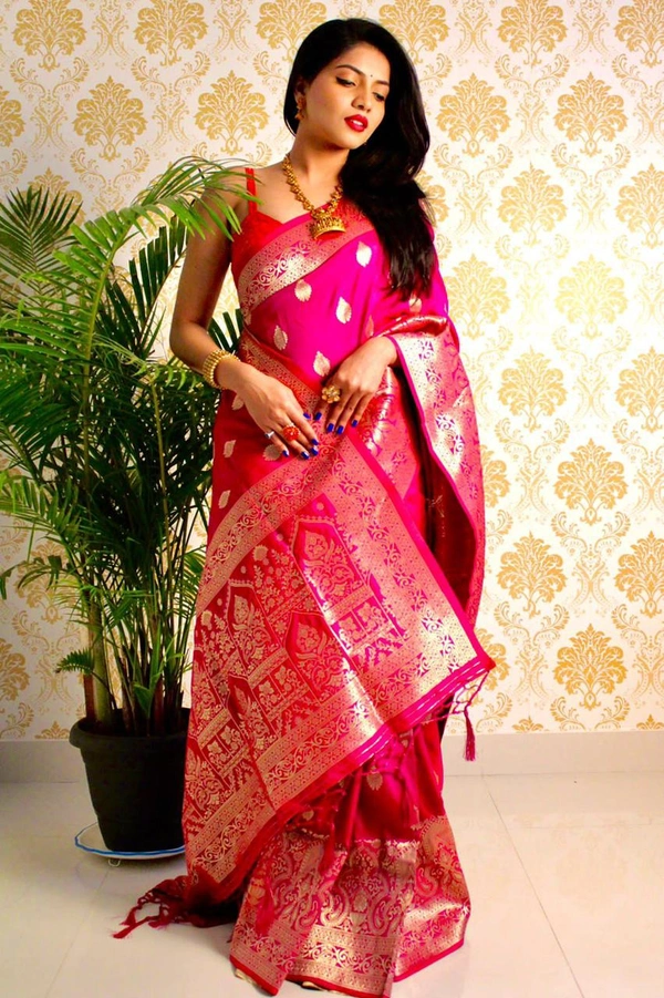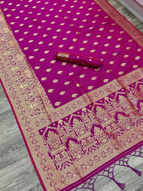 Fabric : Beautiful Soft Banarasi Silk Saree with beautiful zari woven geometric pattern all over saree with designer rich big border and weaving Designer Pallu along with exclusive Tassels attached along with it..