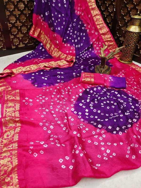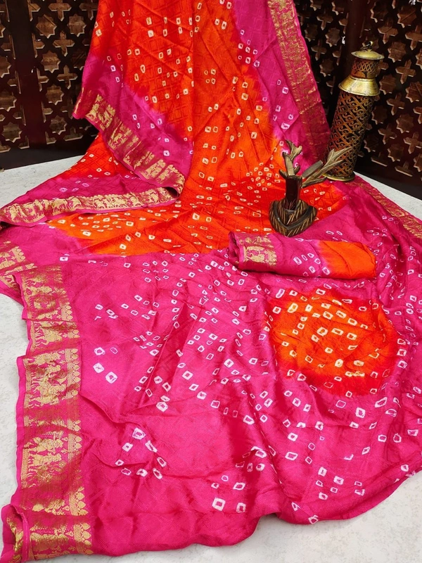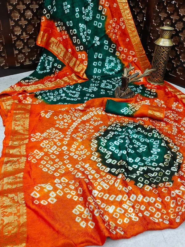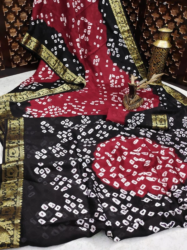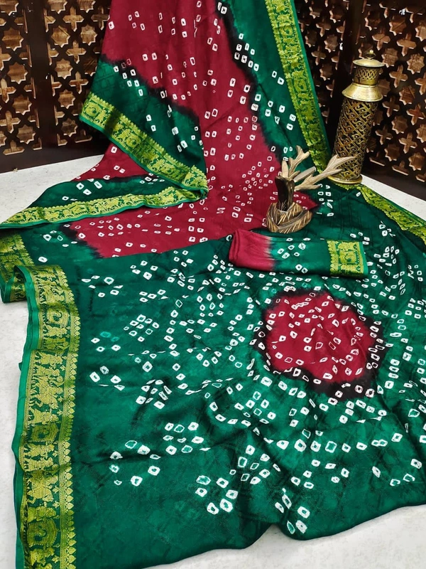 *Pure Bandhej silk* saree made by *original Bandhej with zari weaving Border with bandhej Rich Pallu * saree with beautiful design and having a *Barati* Pattern border.