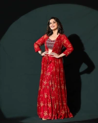Looking for this same colour beautiful *Madhuri Dixit* Designer Shrug On Havy Gorgette febric with Digital print and Sharara palazzo on also Gorgette febric with inner and digital print.