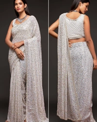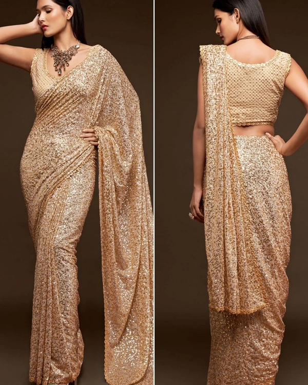 *RATE-1499/-+Ship* *Latest saree collection* *Fabric details* *Saree fabric & work* Georgette with all over seqwance work (4.50 mtr saree work) saree length- 5.50 Mtr *Blouse fabric & work* Satin banglori with seqwance work *( both side work front and back )* Blouse length - 1 Mtr *Note-* 👉 Saree's lace fabric is satin banglori with cut work 👉Blouse work is both side front and back 👉Saree weight- Approx 1 Kg